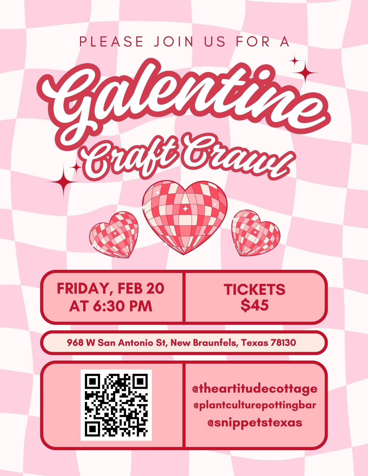 The Galentine’s Craft Crawl is a social evening where you’ll visit three creative shops, each offering a hands-on craft, tasty snacks, and a welcoming place to hang out. It’s a great chance to try something new, enjoy good food, and spend time with people who love making things as much as you do.